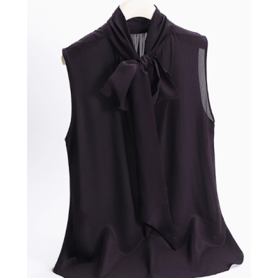真丝雪纺无袖衬衫女新款飘带领蝴蝶结桑蚕丝上衣度假风衬衣